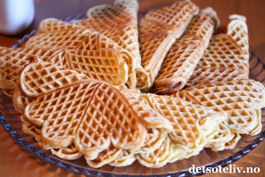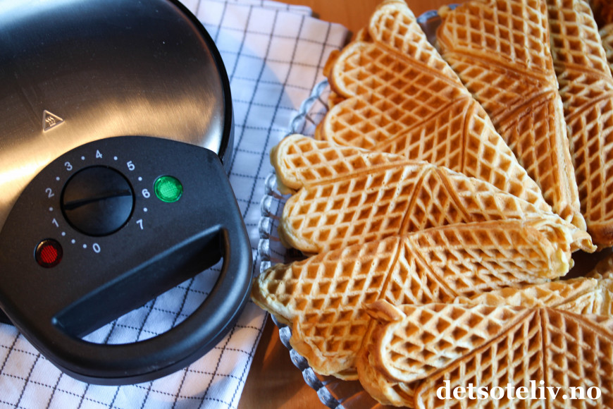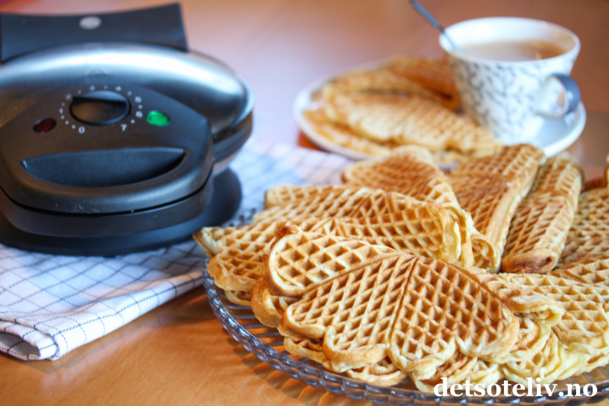 4. La deigen stå og svelle i ca 30 min. Stek vafler i vaffeljern på middels varme. Bruk gjerne litt ekstra smør under stekingen.